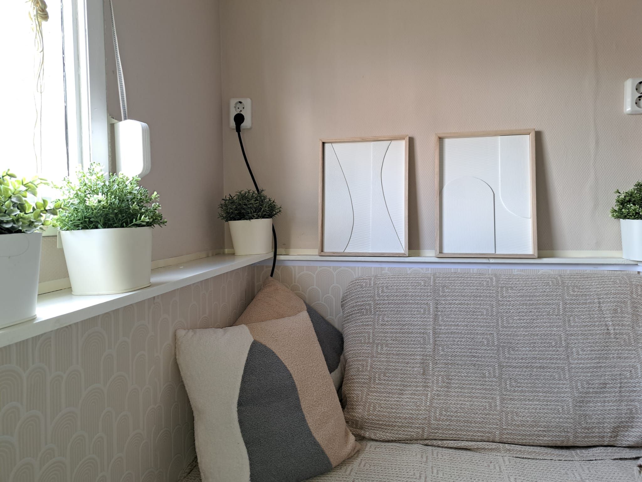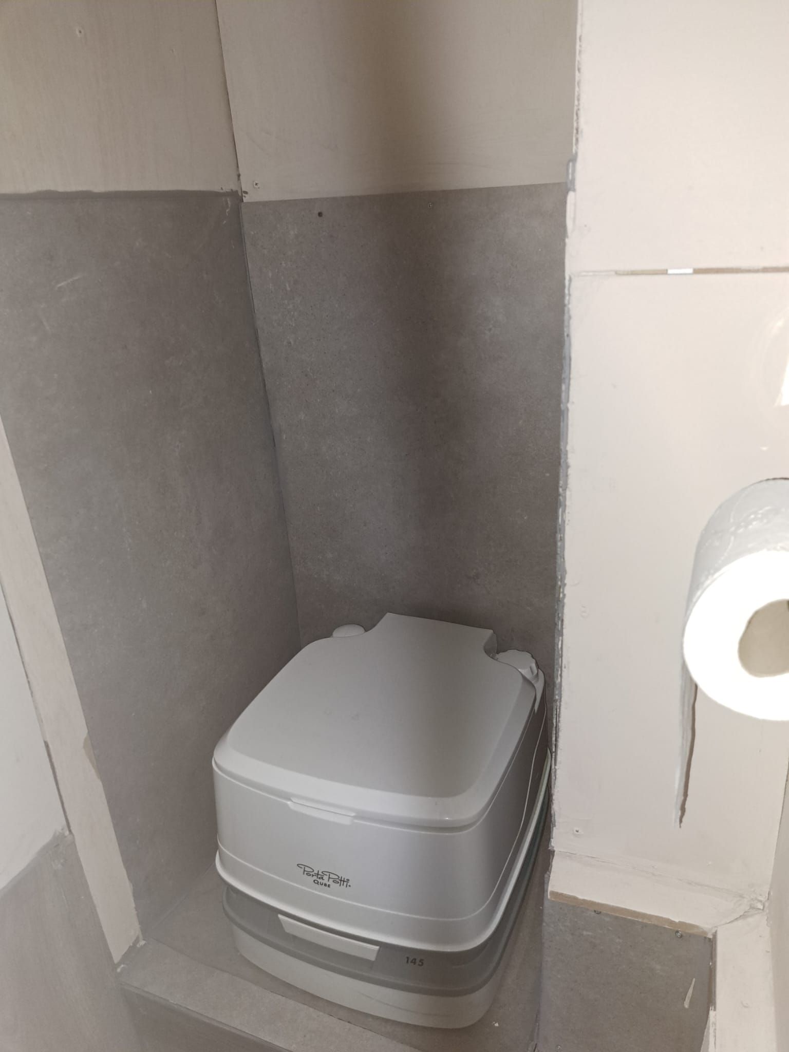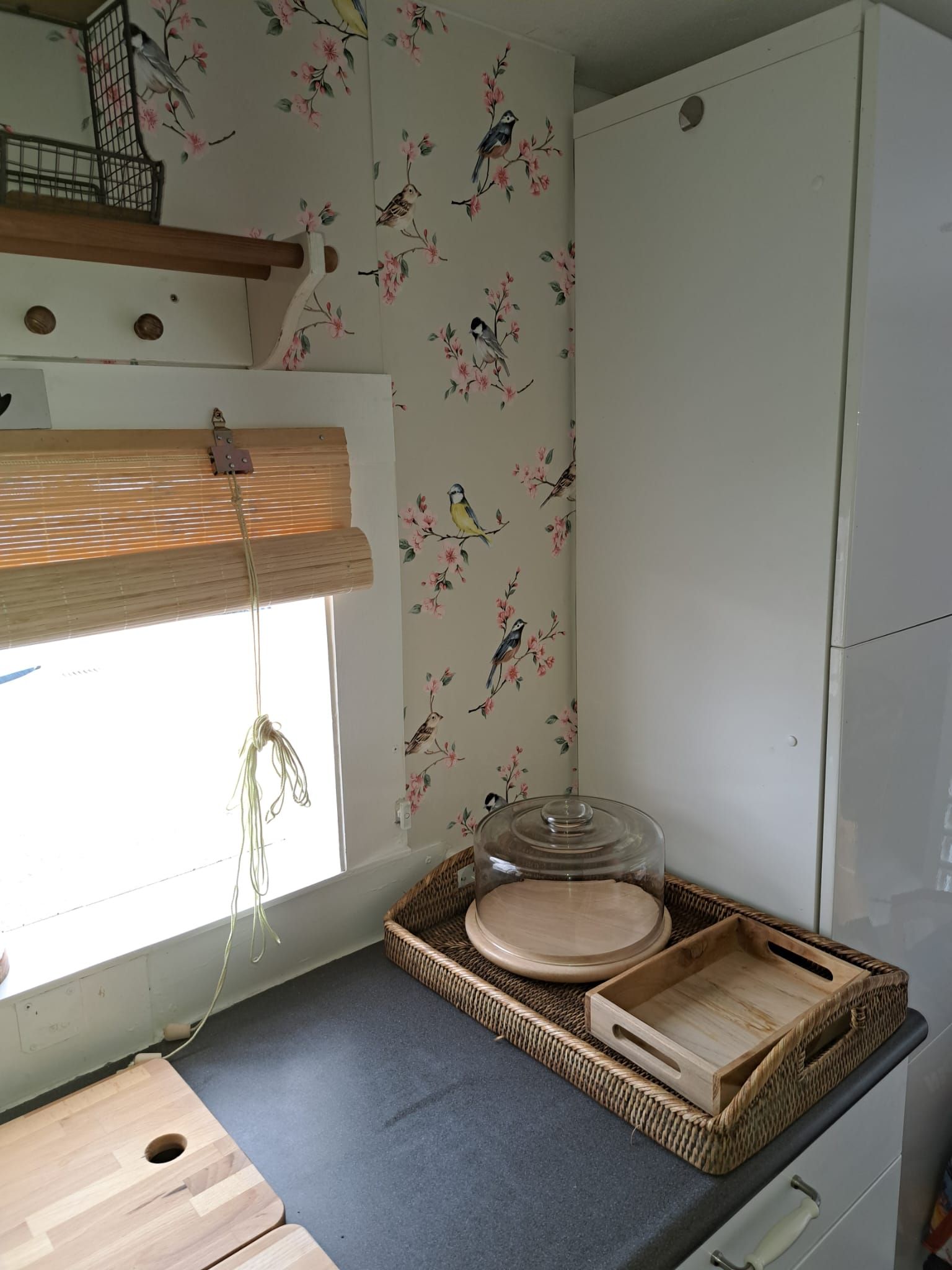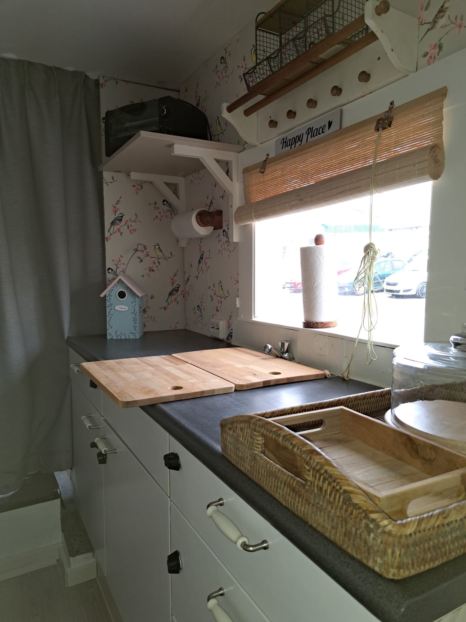Aanrecht met wasbak, stroomvoorziening d.m.v. walstroom . ramen aan de zijkanten en achterkant.